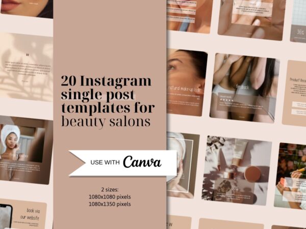 A set of 20 customizable Canva templates for beauty businesses, salons and spas. Perfect for promoting your services, building a brand, and saving time on content creation.